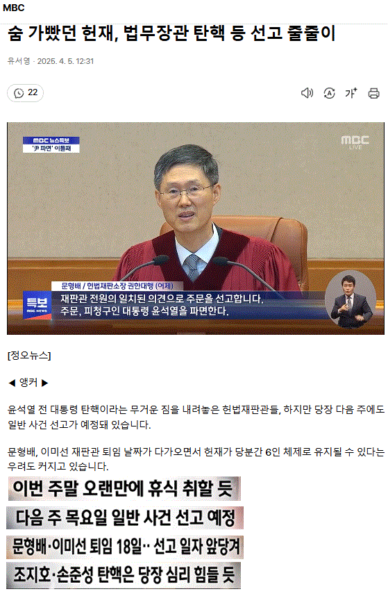 조희대를 탄핵시킨다고 해서 헌재가 파면시킬지는 미지수지만 그래도 탄핵 시켜야죠 헌재가 조희대를 파면시키지 않는다면 헌재도 그에 합당한 댓가를 치루어야 할것이고 탄핵과 별도로 조희대를 하루빨리 파면시킬수 있는 법도 발의하고 통과시키면 좋겠구요 대법원장 정년을 조정해서 자리에서 하루빨리 내려오게 해도 되구요 민주당이 일을 해야지 진행이 되겠죠