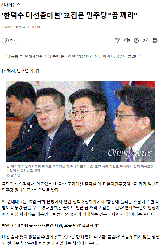 '한덕수 대선출마설' 꼬집은 민주당 "꿈 깨라"