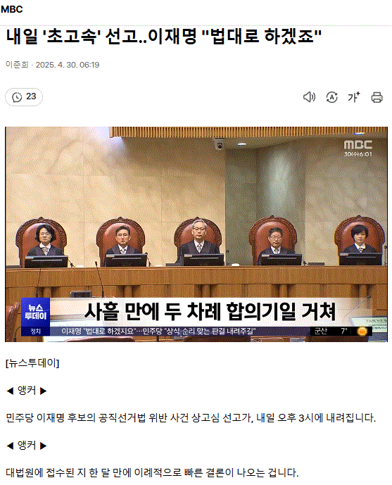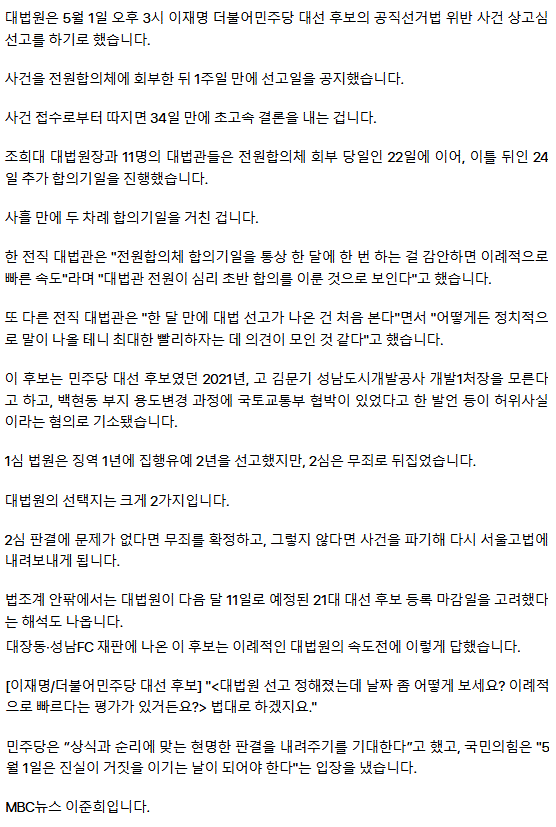 내일 '초고속' 선고‥ 이재명 "법대로 하겠죠"