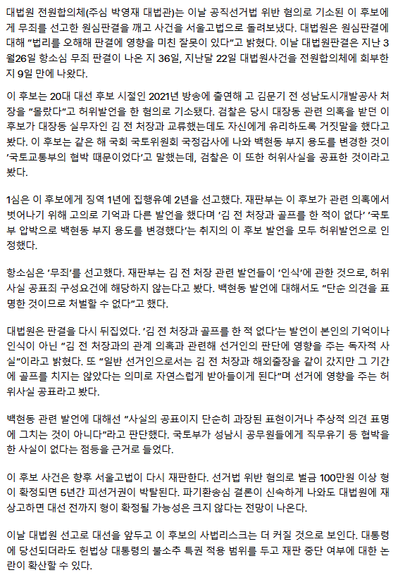 대법, 이재명 ‘선거법 위반’ 유죄로 파기환송··· “골프·백현동 발언 허위”