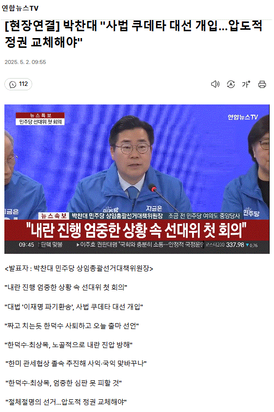 [현장연결] 박찬대 "사법 쿠데타 대선 개입… 압도적 정권 교체해야"