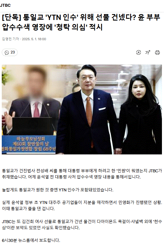 [단독] 통일교 'YTN 인수' 위해 선물 건넸다? 윤 부부 압수수색 영장에 '청탁 의심' 적시