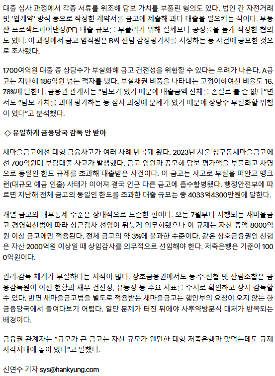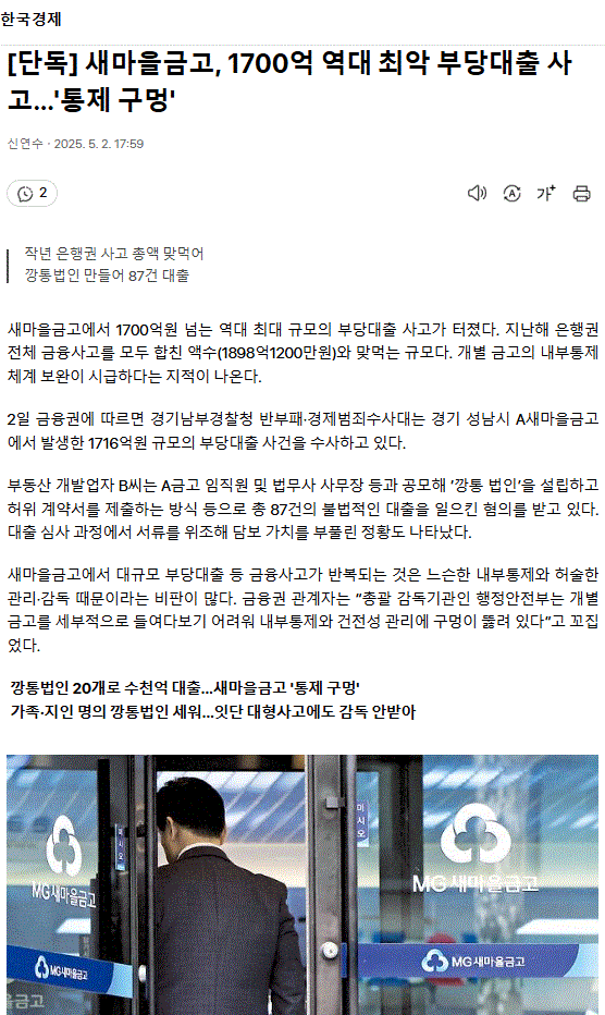 [단독] 새마을금고, 1700억 역대 최악 부당대출 사고… '통제 구멍'ㅡ 도둑이 많아