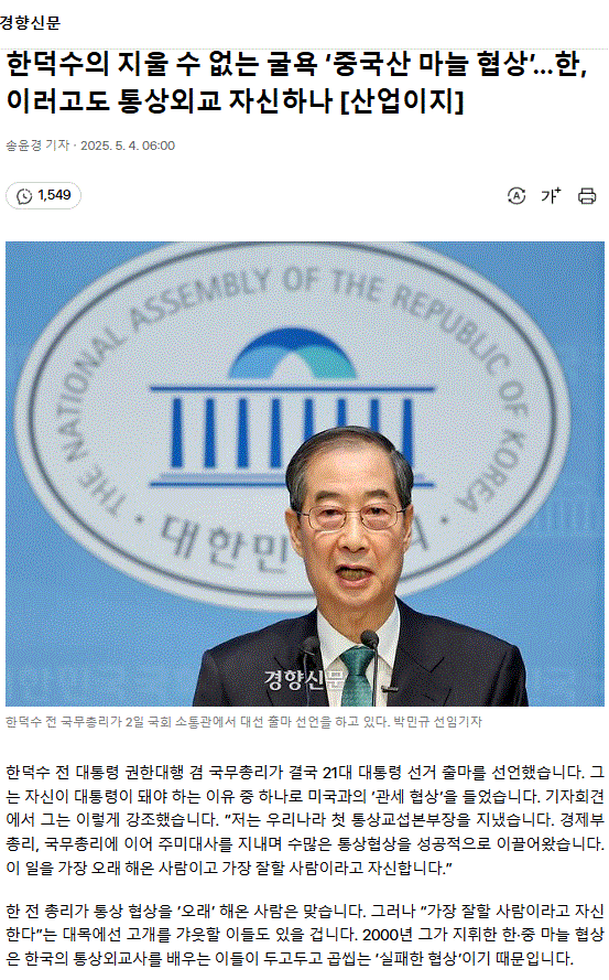 한덕수의 지울 수 없는 굴욕 ‘중국산 마늘 협상’… 한, 이러고도 통상외교 자신하나 [산업이지]ㅡ 매국노 인증하니