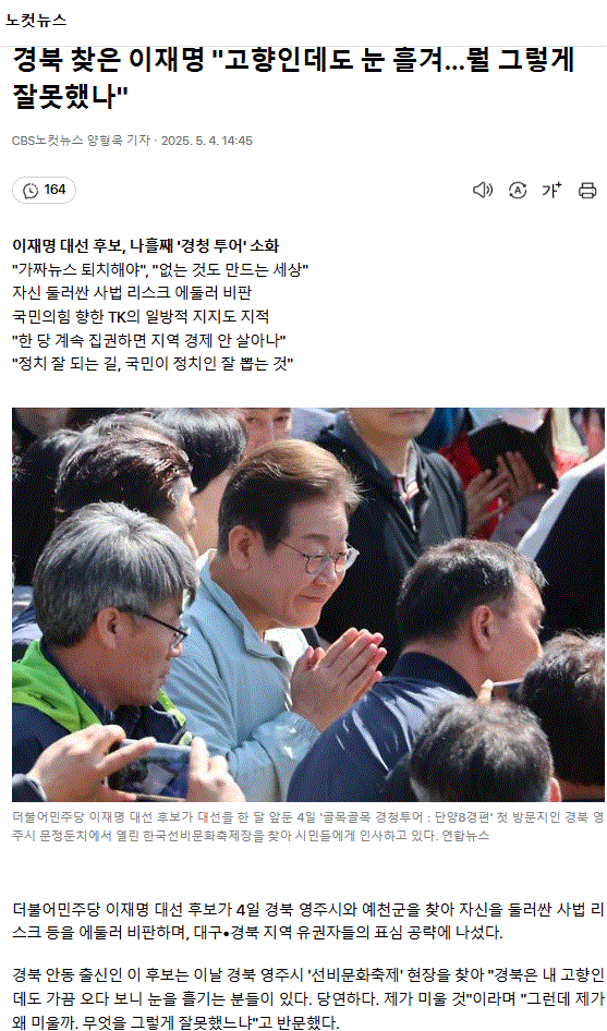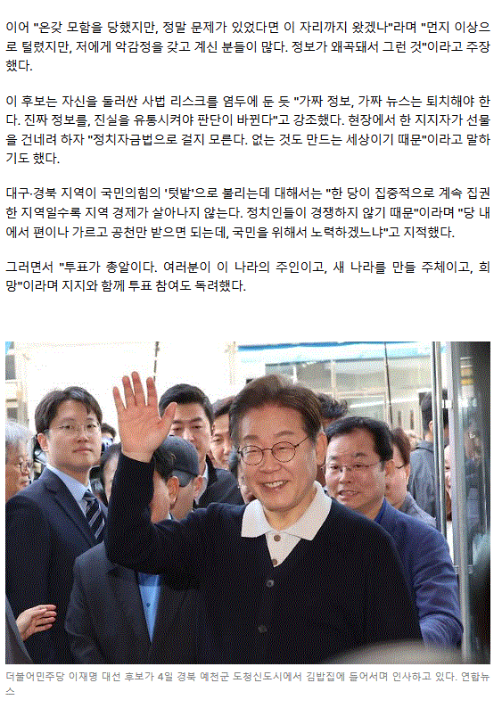 경북 찾은 이재명 "고향인데도 눈 흘겨… 뭘 그렇게 잘못했나"ㅡ 언론의 악마화에 놀아나는 국민