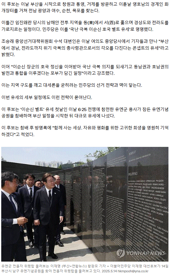 이재명, 영호남 '국난극복 이순신 벨트' 횡단… "동서 통합과 발전"(종합)