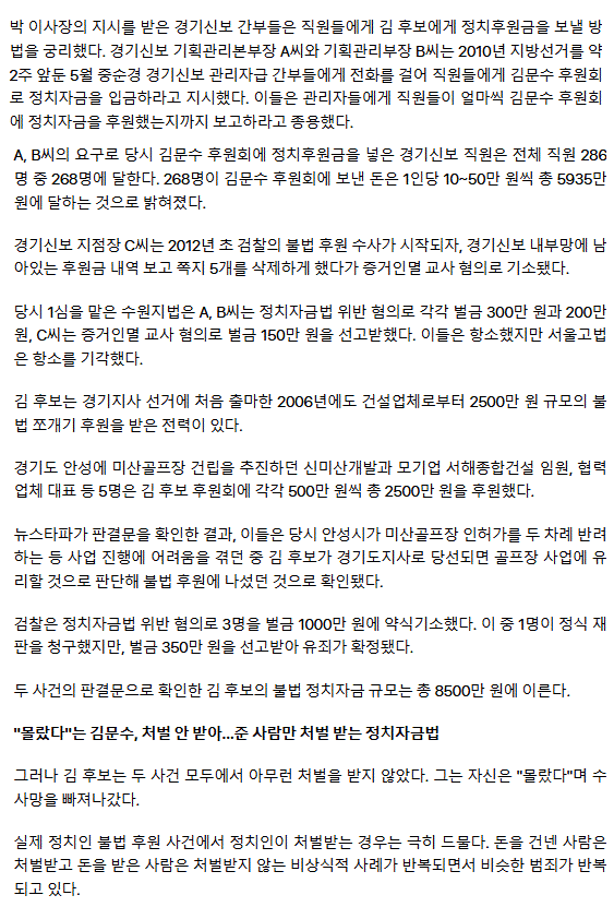 '청렴 강조' 김문수, 경기도지사 시절 8천만원 불법 후원금 수수 ㅡ 관련자들은 처벌, 무죄 받았다며