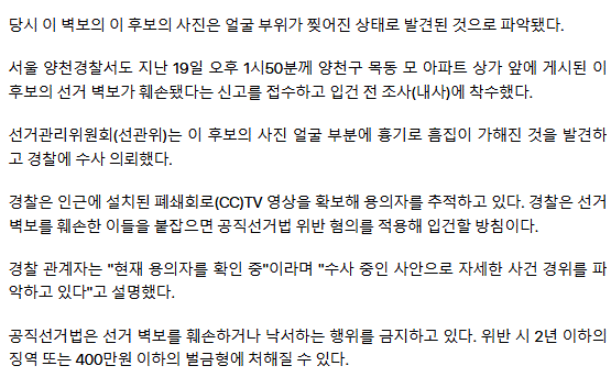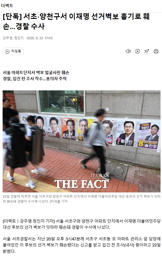 [단독] 서초·양천구서 이재명 선거벽보 흉기로 훼손… 경찰 수사