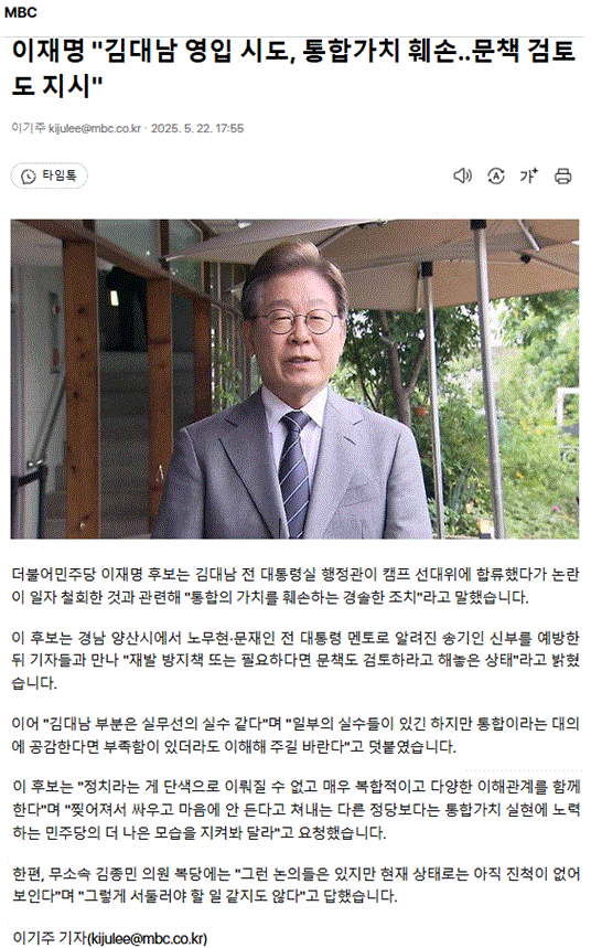 이재명 "김대남 영입 시도, 통합가치 훼손‥ 문책 검토도 지시"