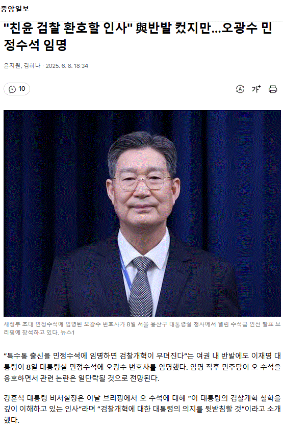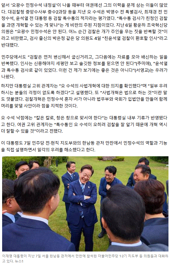 "친윤 검찰 환호할 인사" 與반발 컸지만… 오광수 민정수석 임명 ㅡ 도이치모터스 관련 있다는 의혹, 윤석열 라인이라네요ㅡ 민정수석 임명 철회