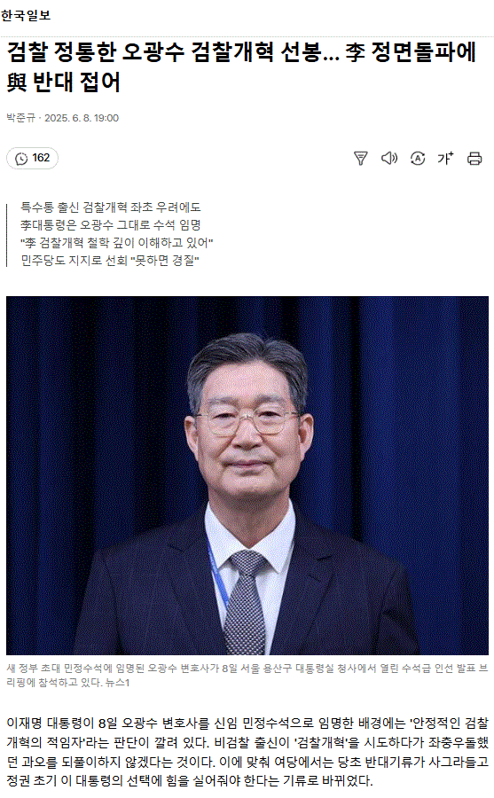 검찰 정통한 오광수 검찰개혁 선봉... 李 정면돌파에 與 반대 접어 ㅡ 윤석열 라인