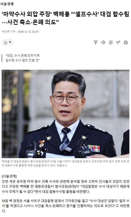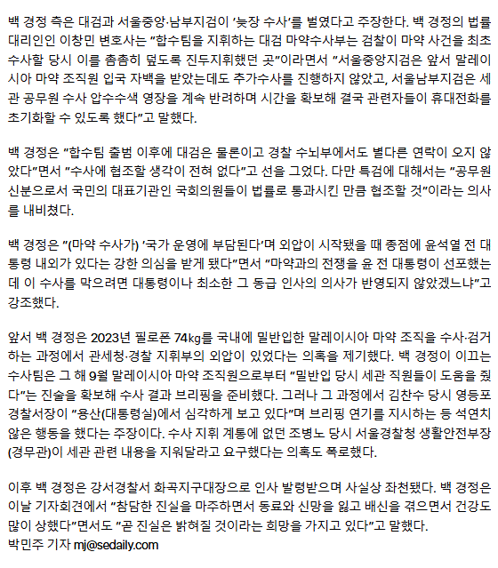 '마약수사 외압 주장' 백해룡 "'셀프수사' 대검 합수팀··· 사건 축소·은폐 의도"