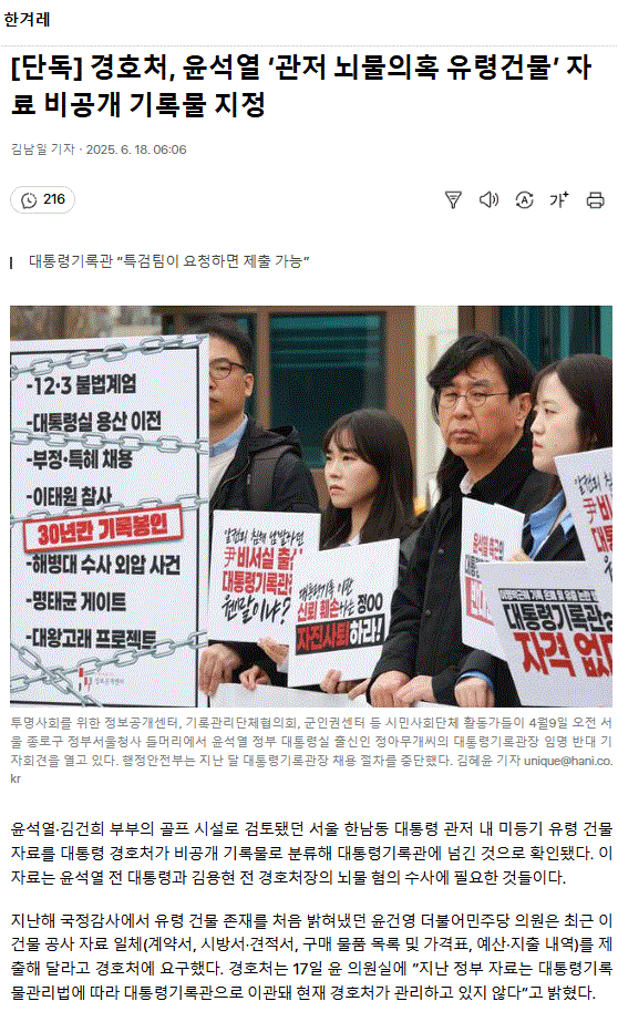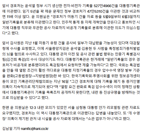 [단독] 경호처, 윤석열 ‘관저 뇌물의혹 유령건물’ 자료 비공개 기록물 지정