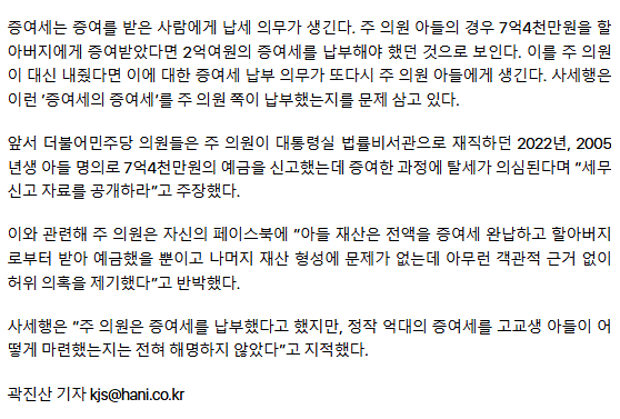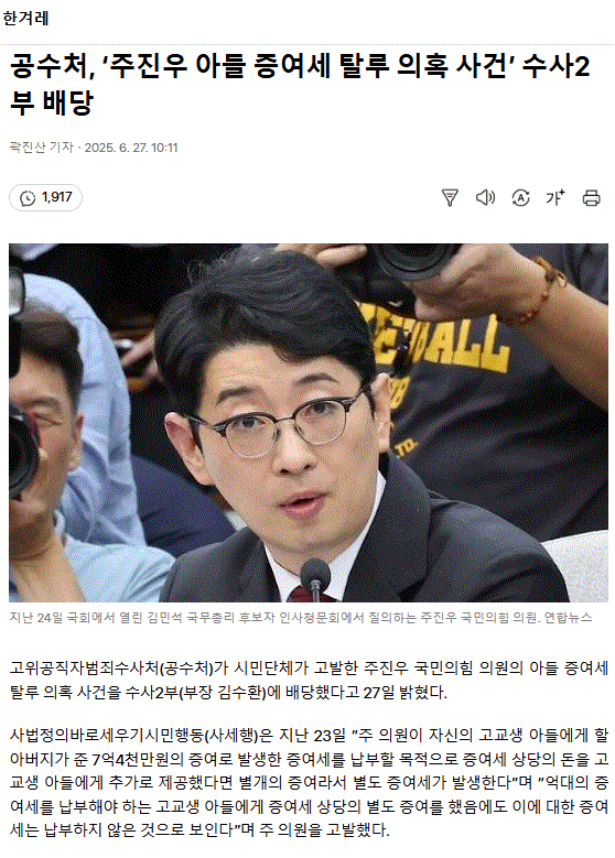 공수처, ‘주진우 아들 증여세 탈루 의혹 사건’ 수사2부 배당