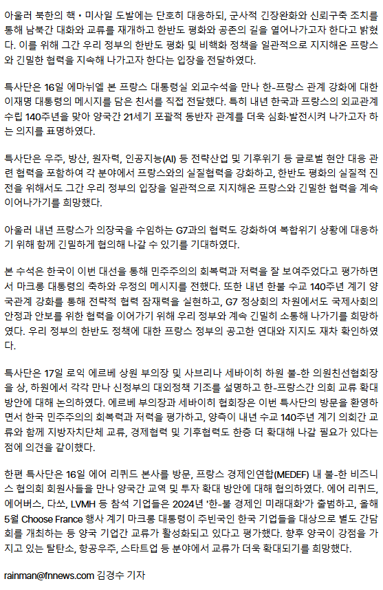 李대통령특사단, 프랑스 대통령실·상하원과 면담.. 내년 한불 수교 140주년 계기협력 강화