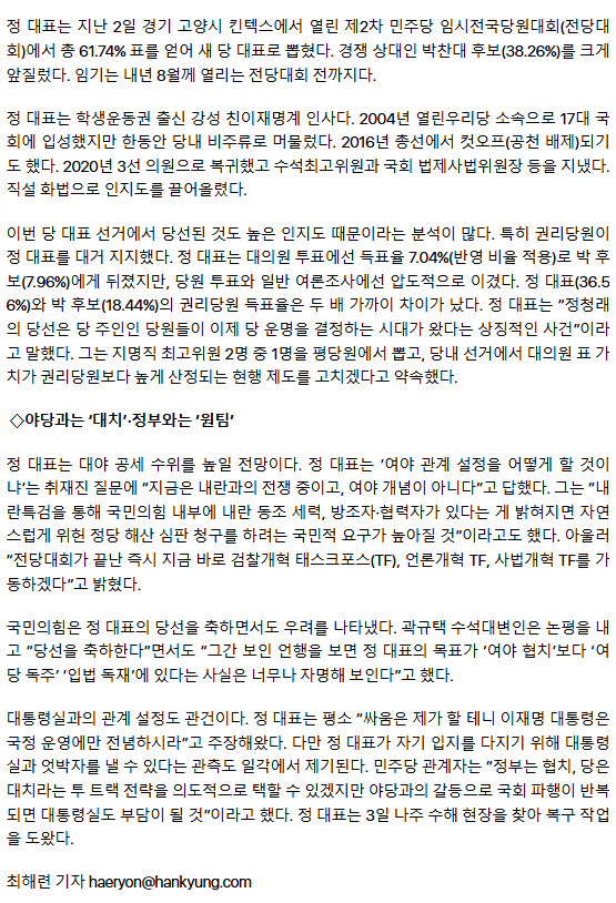맞습니다. 정청래가 당대표가 되서 민주당을 도로 수박당으로 만들려구 합니다. 김어준.정청래.문제인등으로 뭉치고 수박들도 끌어 들일려구 70만명정도 유령당원 모집으로 판을 엎을려구 합니다. 큰일 났습니다.