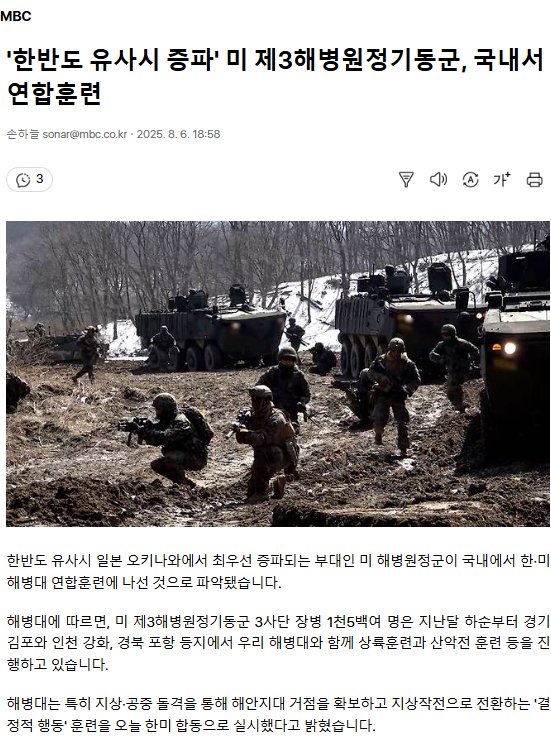 '한반도 유사시 증파' 미 제3해병원정기동군, 국내서 연합훈련