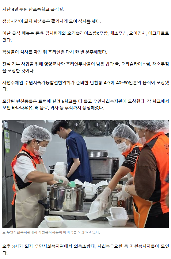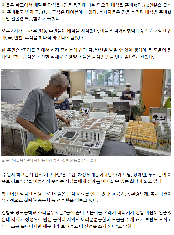 [르포] “생계에 큰 도움이 돼”… 수원시 학교급식 잔식 기부사업 ‘찬사’