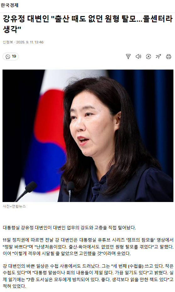 강유정 대변인 "출산 때도 없던 원형 탈모… 콜센터라 생각"ㅡ 참느라 힘들었을 것