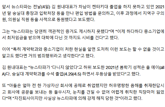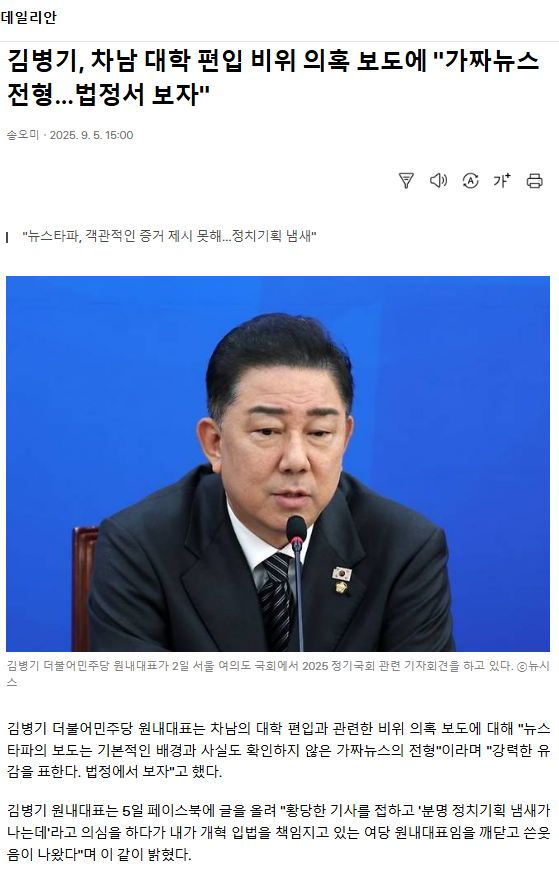 김병기, 차남 대학 편입 비위 의혹 보도에 "가짜뉴스 전형… 법정서 보자"