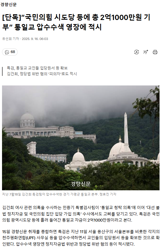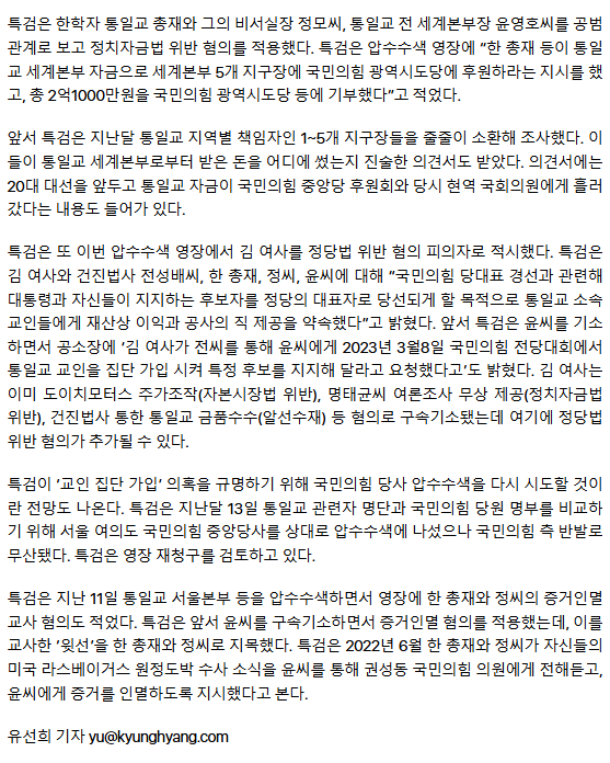 [단독] “국민의힘 시도당 등에 총 2억1000만원 기부” 통일교 압수수색 영장에 적시