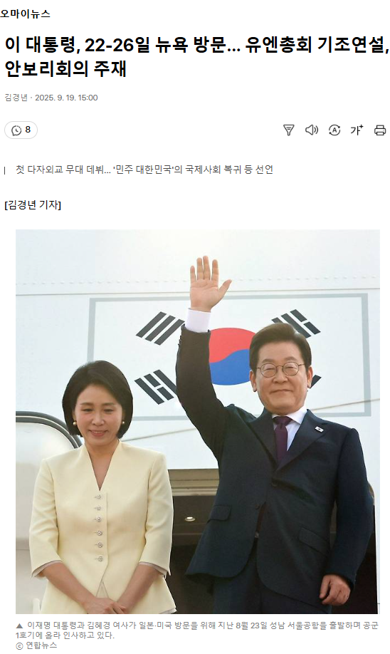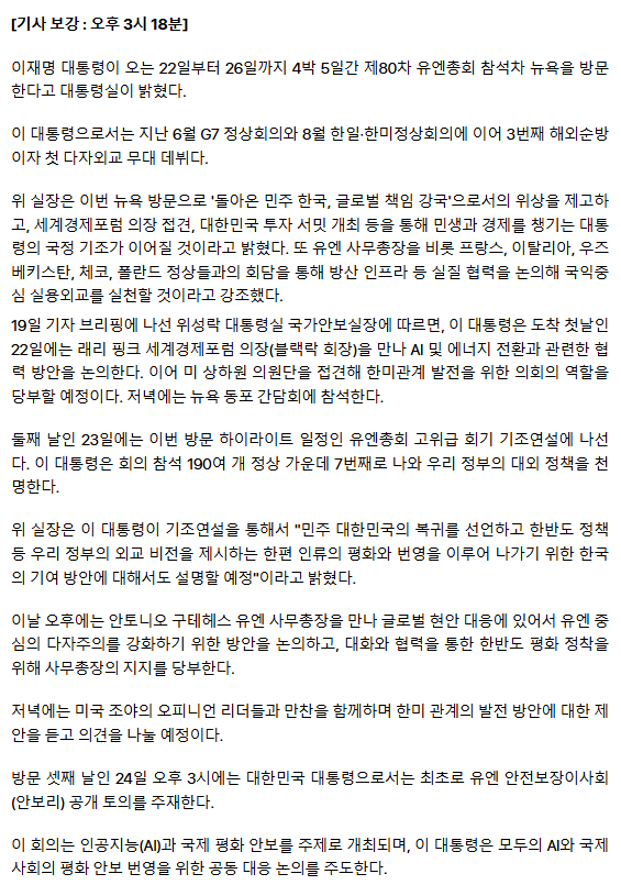 이 대통령, 22-26일 뉴욕 방문... 유엔총회 기조연설, 안보리회의 주재