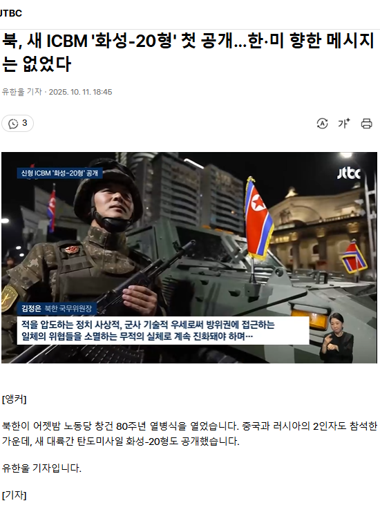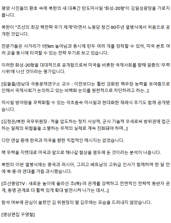 북, 새 ICBM '화성-20형' 첫 공개… 한·미 향한 메시지는 없었다