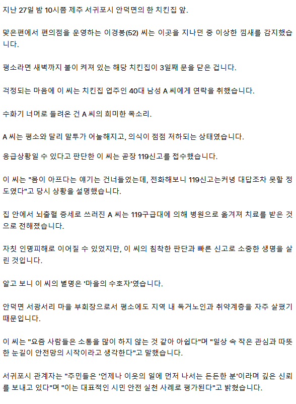 "이상한데?" 3일 문 닫은 치킨집.. 뇌출혈 업주 구한 '작은 관심' ㅡ 119가 큰일 했네 [삶맛세상]