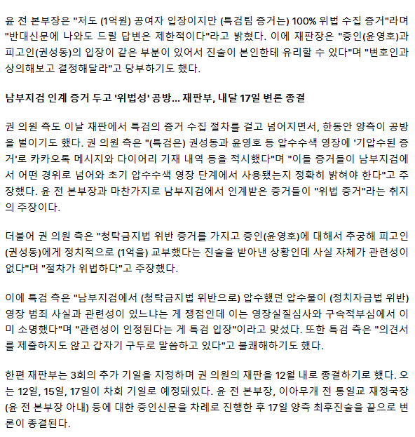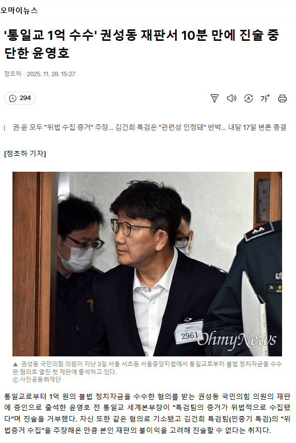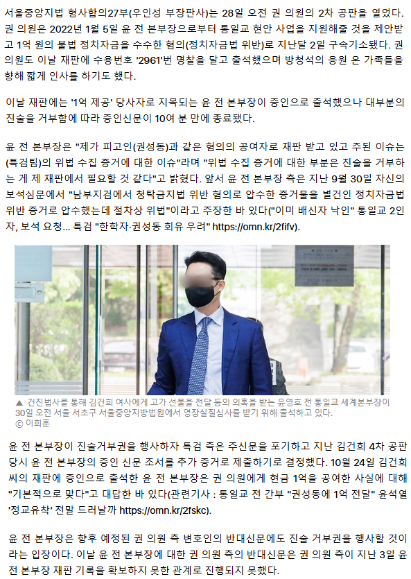 '통일교 1억 수수' 권성동 재판서 10분 만에 진술 중단한 윤영호
