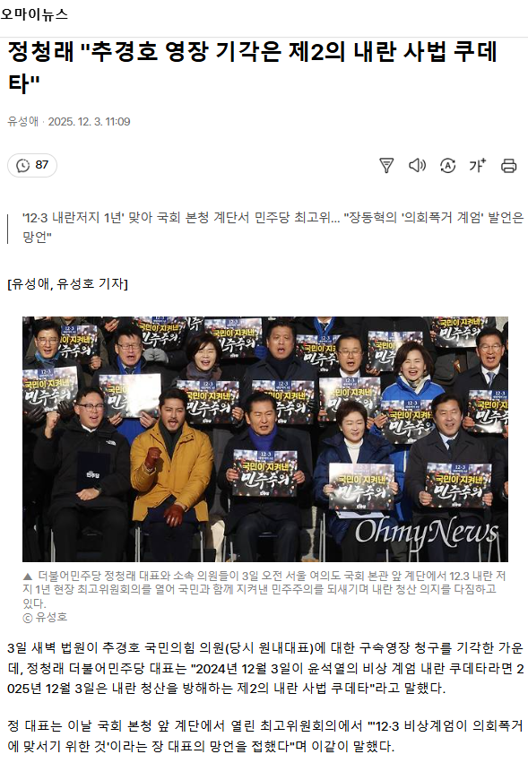 내란재판부는 9월에 발의되었고 당 지도부가 위헌소지를 고려하여 보류하였다 하고 딴지를 민심의 바로미터로 여기는 정청래인데 딴지가 정청래를 비판하면 정청래가 민심이 무서워서 했겠지 딴지가 정청래를 옹호하고 비판하지 않고 되려 비판하는 당원들 갈라치기세력이라면서 입틀막시키니 내란청산이 제대로 안되고 있다고 보여짐