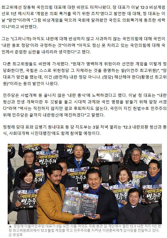 당대표가 내란척결에는 관심없고 자기정치에 열내고 있으니 당의 기강이 말이 아닌가보네 정청래 딴대는 1인1표제로 당규위반 날치기 투표에 당원의 소리는 귀닫고 문진석 원내부대는 청탁사진이나 찍히고 최민희는 딸 축의금 반환으로 사진 찍히고 장경태는 또 이준석 무리랑 어울려 동영상 찍히고 되려 큰소리치면서 당을 소란스럽게 하고 정청래 문진석 최민희 사퇴하시고 장경태는 탈당하시면 되겠네요