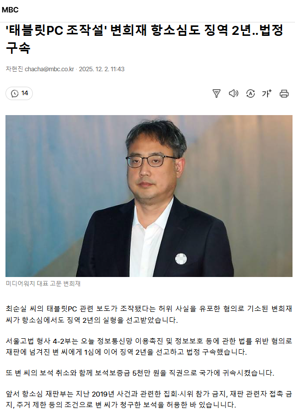 '태블릿PC 조작설' 변희재 항소심도 징역 2년‥ 법정구속