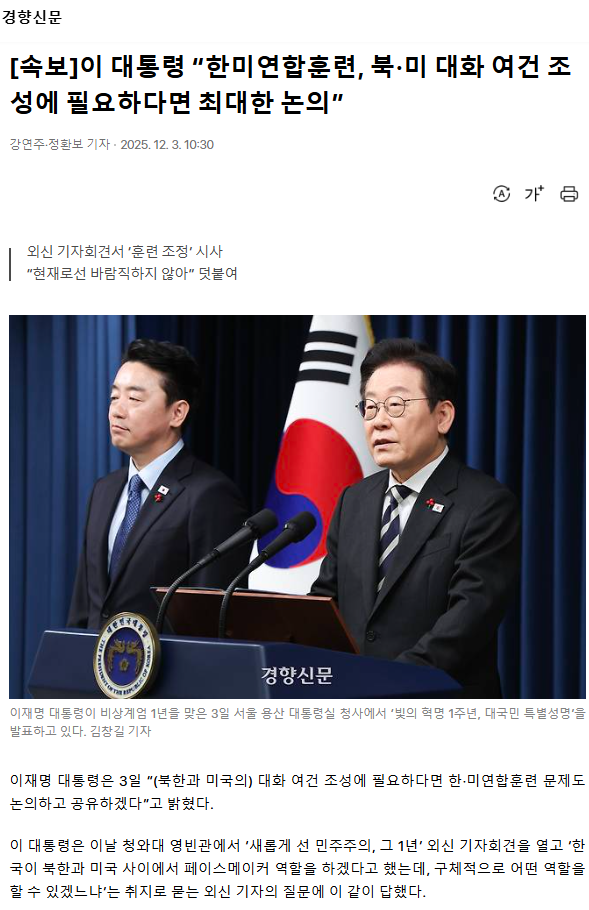 [속보] 이 대통령 “한미연합훈련, 북·미 대화 여건 조성에 필요하다면 최대한 논의”