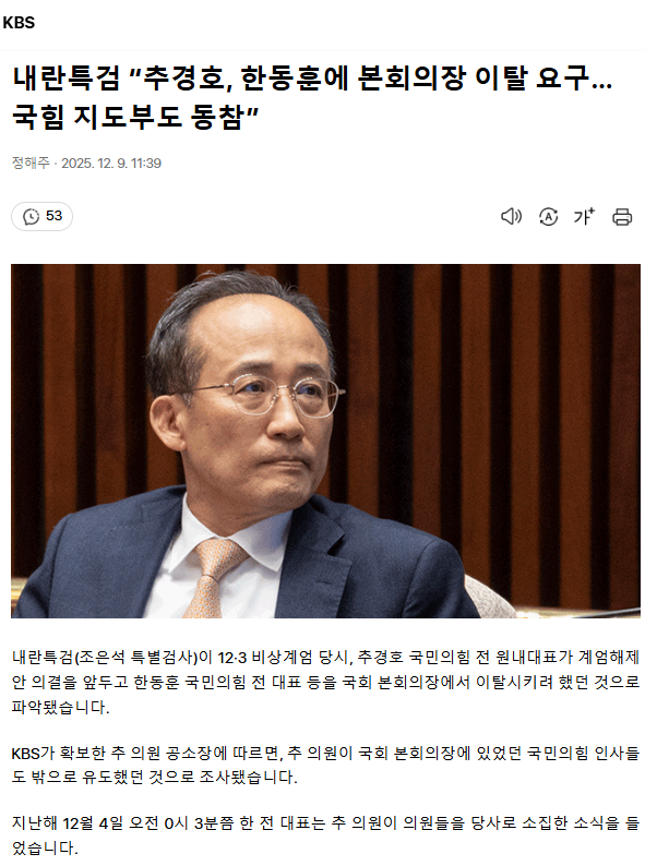 내란특검 “추경호, 한동훈에 본회의장 이탈 요구… 국힘 지도부도 동참”ㅡ추경호, 한동훈을 구속하라
