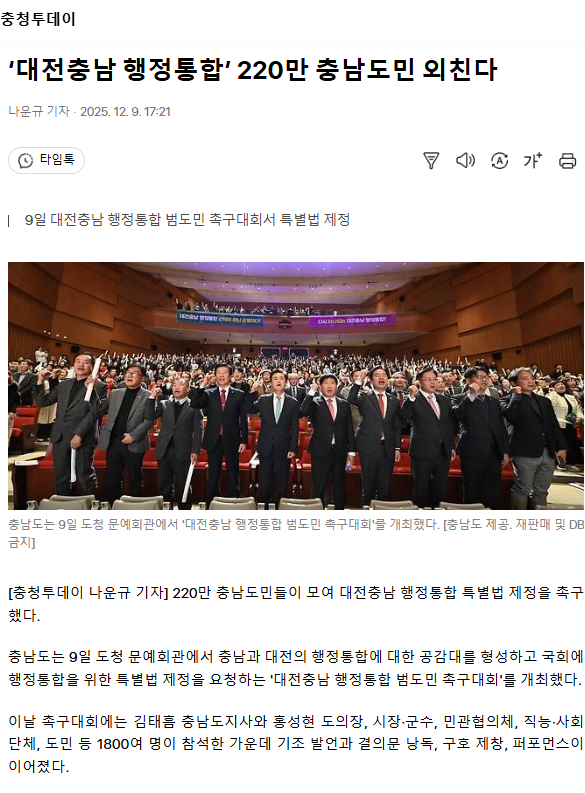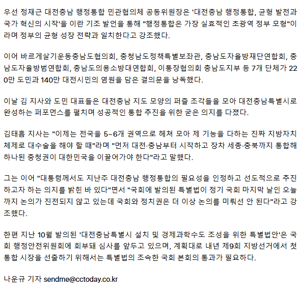 ‘대전충남 행정통합’ 220만 충남도민 외친다