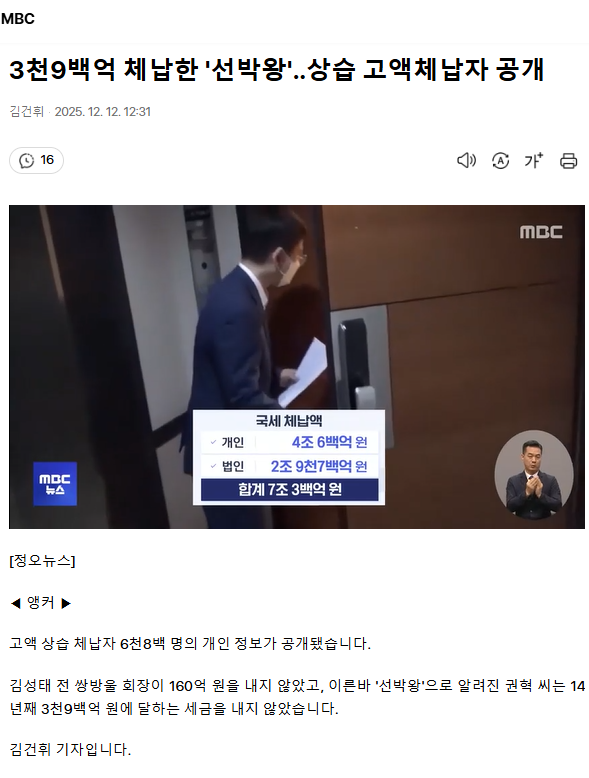 3천9백억 체납한 '선박왕'‥ 상습 고액체납자 공개 ㅡ 선박왕 시도탱커홀딩 회장, 쌍방울 김성태