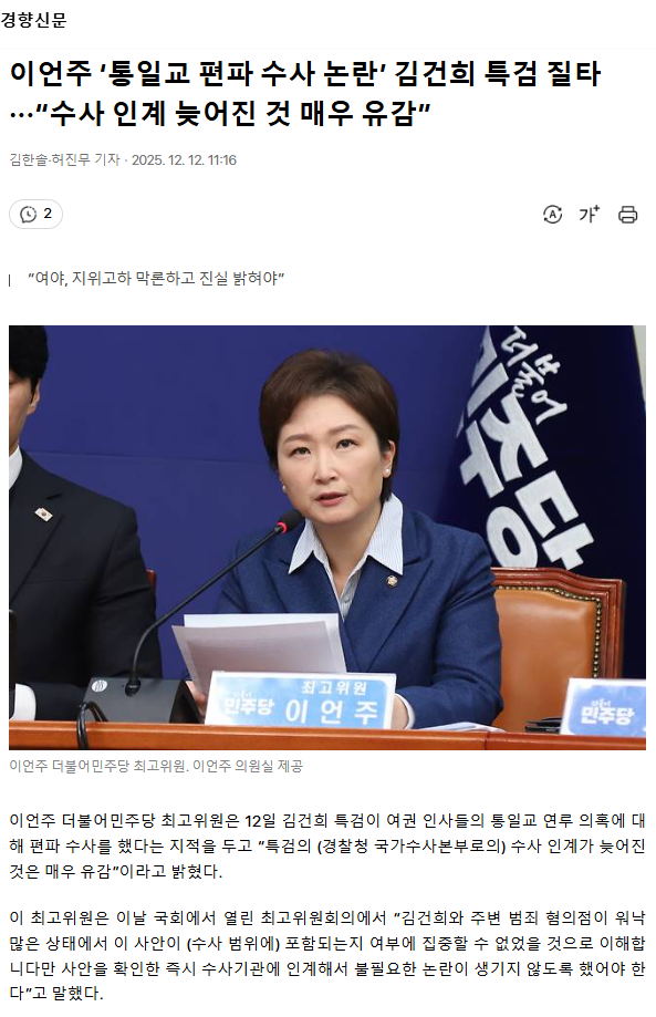 이언주 ‘통일교 편파 수사 논란’ 김건희 특검 질타··· “수사 인계 늦어진 것 매우 유감”