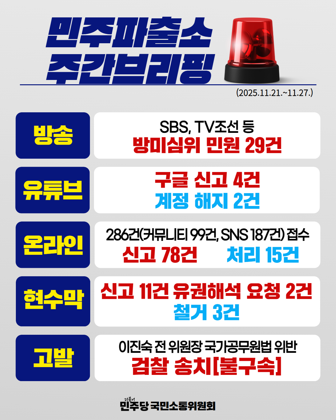[더불어민주당 국민소통위원회 민주파출소 주간브리핑(11. 28, 금)] 안녕하십니까. 더불어민주당 국민소통위원회 위원장 김현, 전용기입니다.11월 28일 금요일, 민주파출소 주간 주요 대응 현황 브리핑 시작하겠습니다. 민주파출소 제보 현황에 대해 보고드립니다. 11월 28일 00시 기준으로 한 주간 3,977명이 방문하였고, 873건의 제보가 접수 되었습니다. 누적 건수로는 총 708,191명이 민주파출소를 방문하여, 총 216,583건의 제보가 접수됐습니다. 매체별로 온라인이(커뮤니티+SNS) 330건(32%) 제보되어 가장 많이 제보되었고, 현수막 154건(15%), 유튜브 135건(13%) 순으로 제보됐습니다. 민주파출소 주요 대응 현황 보고드립니다. 방송 대응 보고입니다. 한 주간 시사 프로그램 및 뉴스, 라디오를 모니터링한 결과, 패널 불균형으로 인한 공정성 위반 사례 29건을 확인하였으며, 이에 대해 방송미디어통신심의위원회에 민원을 접수했습니다. 유튜브 대응 보고입니다. 최근 AI 기술을 이용해 이재명 대통령을 사칭하며 투자 권유를 하는 영상이 제작·유포되고 있습니다. 이는 명백한 사칭 범죄로, 확인 즉시 경찰 신고 또는 민주파출소 제보를 부탁드립니다. 해당 사칭 영상을 포함해 영상 3건, 채널 1건을 구글 측에 신고 조치했으며,기존 신고 건 중 위반이 확인된 2개 채널이 계정 해지된 것을 보고드립니다. 현수막 대응 보고입니다. 이번 주에는 11건의 불법 현수막을 신고했고, 기존 신고 건 중 3건이 철거되었습니다. 또한 「내일로미래로당」 현수막과 공공청사 내 정치 현수막 게시와 관련하여중앙선거관리위원회에 2건의 유권해석을 요청한 상태입니다. 아울러 국회 행정안전위원회는 혐오·비방성 정당 현수막 규제 강화를 골자로 한 「옥외광고물 등의 관리와 옥외광고산업 진흥에 관한 법률」 개정안을 의결했습니다. 개정안에는 △국가·지역·종교 등을 이유로 한 차별적 문구 금지 △정당 활동 현수막 관련 배제 조항 삭제 등이 포함되어 있어, 본회의 통과 시 거리 불법 현수막 규제와 대응력이 크게 강화될 전망입니다. 민주파출소는 이에 맞춰 더욱 체계적이고 적극적인 대응을 준비하겠습니다. 온라인 대응 보고입니다. 한 주간 온라인 부문 제보 건수는 총 286건(커뮤니티 99건, SNS 187건)이었습니다. 이들 제보 중 58건을 플랫폼 신고처리했으며 13건은 삭제 등 제재되었습니다. 온라인 부문 주요 제보 이슈는 ▲대통령 및 영부인 모욕 비방 ▲세월호 관련 가짜뉴스 ▲주진우의원 허위사실 선동 ▲내란선동·윤석열 옹호 계정 및 게시물이었습니다. 극우세력의 대통령 및 영부인에 대한 모욕과 비방은 계속 이어지고 있으며, 특히 세월호 관련 이재명 대통령과의 연관성을 주장하는 가짜뉴스 제보가 증가해 플랫폼 신고 등 조치를 취했습니다. 국민소통위원회는 당원과 국민들께서 신고해주시는 허위조작정보들을 면밀히 검토해 엄중히 대응해나가도록 하겠습니다. 경찰 대응 보고입니다. 지난 한 주간 민주당 소속 국회의원이 부정선거로 당선되었다는 허위사실을 유포한 자, 그리고 대선 당시 이재명 후보의 아들에 대해 허위 비방 정보를 확산한 자에 대해 검찰 송치(불구속) 결정이 내려졌습니다. 또한 이진숙 전 위원장에 대해서는 페이스북·유튜브 게시물 및 출연과 관련하여 국가공무원법 위반 혐의가 인정돼 검찰에 송치(불구속) 결정되었음을 보고드립니다. 이상으로 대응 보고드렸습니다. 2025년도 어느덧 한 달만을 남겨두고 있습니다. 올해는 대통령 탄핵부터 민주정부 4기 출범까지, 우리 역사에 매우 큰 변화들이 이어졌습니다. 민주파출소 또한 그 모든 과정에서 허위 조작 정보로부터 민주주의를 지키기 위해 한순간도 긴장을 늦추지 않았습니다. 하지만 여전히 허위 조작 정보는 형태를 바꾸며 끊임없이 발생하고 있습니다. 남은 한 달, 그리고 다가오는 새해에도 국민소통위원회와 민주파출소는 사실에 기반한 공정한 정보 환경을 구축하기 위해 더욱 단단하고 치밀하게 대응해 나가겠습니다. 허위 조작 정보를 근절하고, 국민 여러분께 ‘청정 정보환경’을 돌려드리기 위해끝까지 최선을 다하겠습니다. 감사합니다. 2025년 11월 28일더불어민주당 국민소통위원회