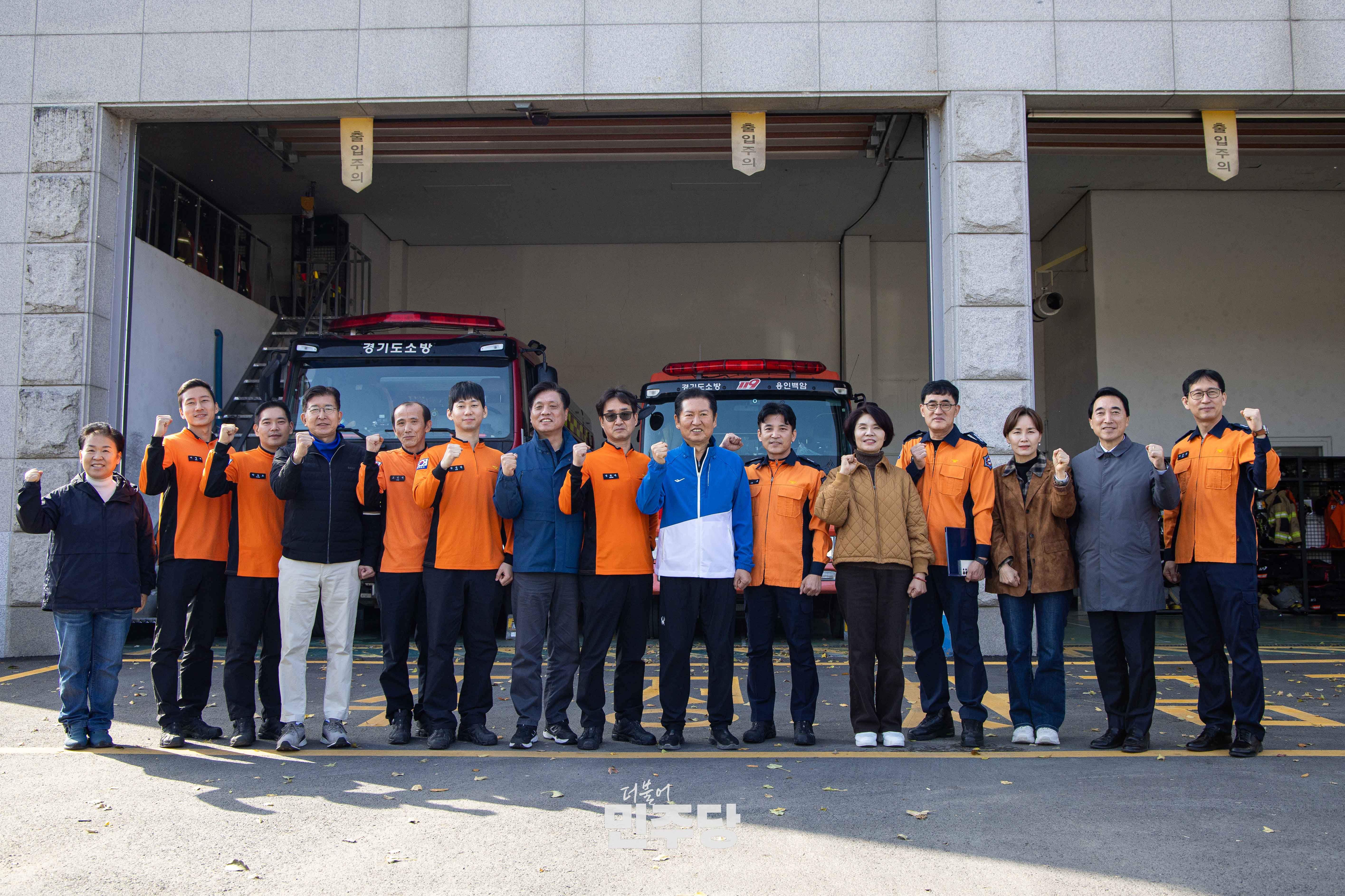정청래 당대표가 2025.11.09.(일) 용인특례시 처인구에 위치한 백암119안전센터에 방문하여 소방관들과 격려하고 간담회를 하고 있다.