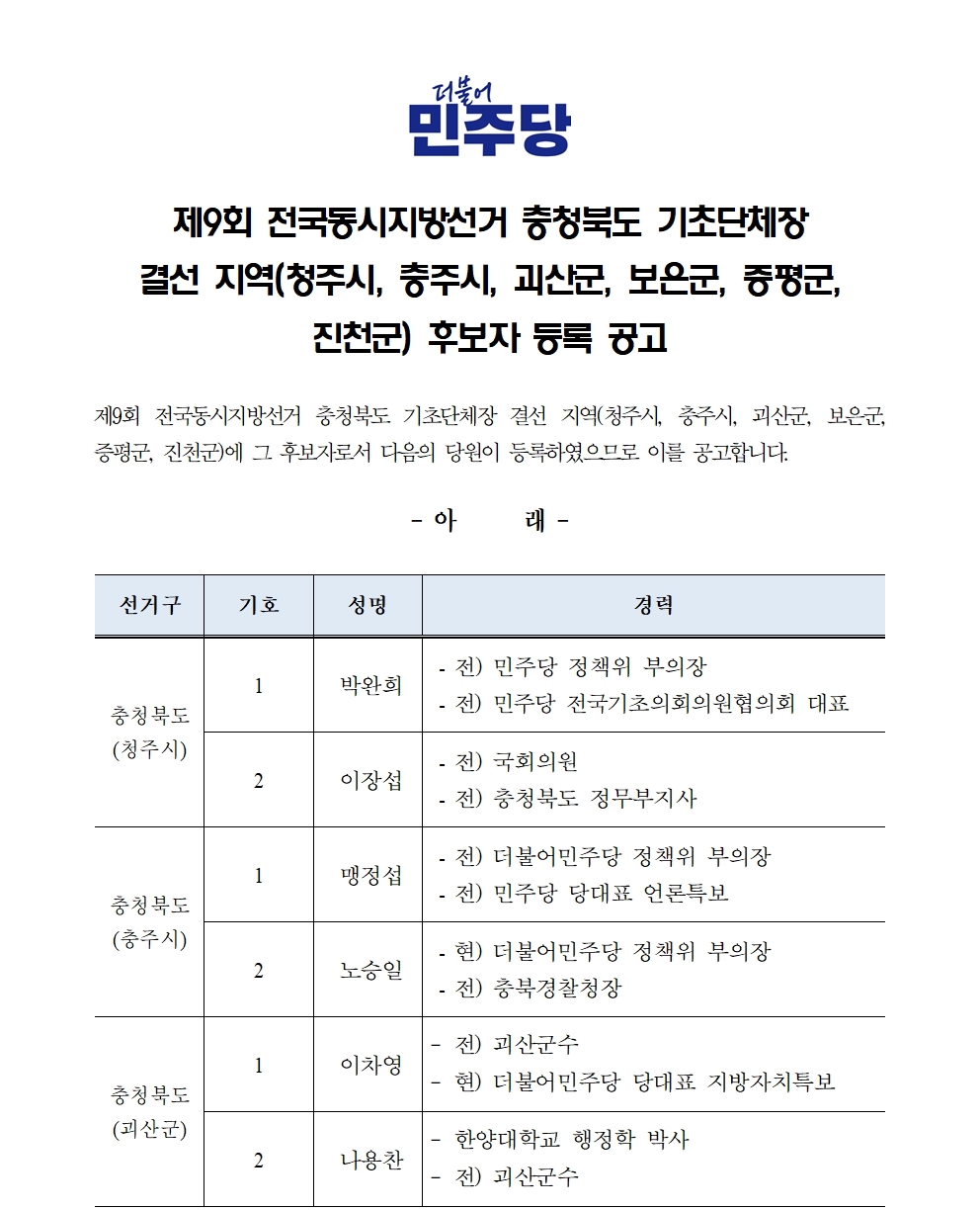 제9회 전국동시지방선거 충청북도 기초단체장 결선 지역(청주시, 충주시, 괴산군, 보은군, 증평군, 진천군) 후보자 등록 현황 공고