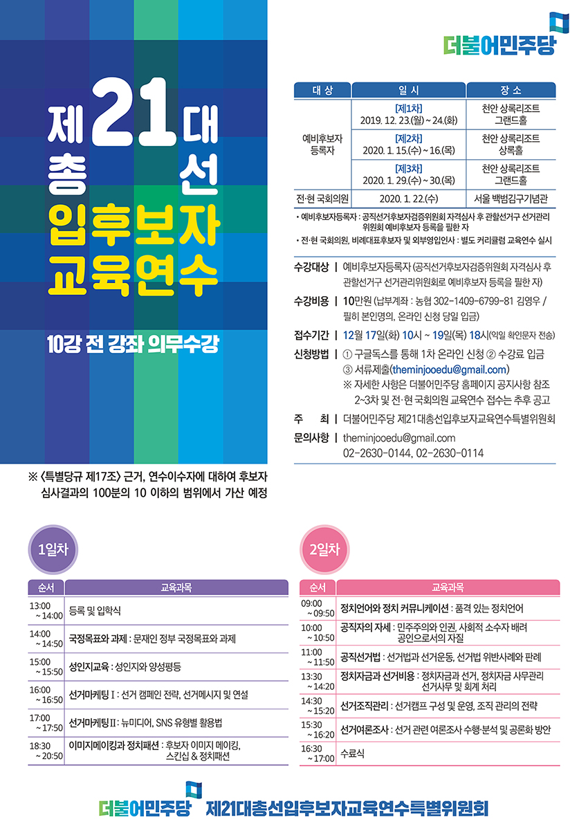 더불어민주당 21대총선입후보자교육연수특별위원회는 제21대 총선 입후보자를 대상으로 교육연수를 아래와 같이 진행합니다. 모든 입후보자는 의무적으로본 교육연수를 이수하여야 합니다.