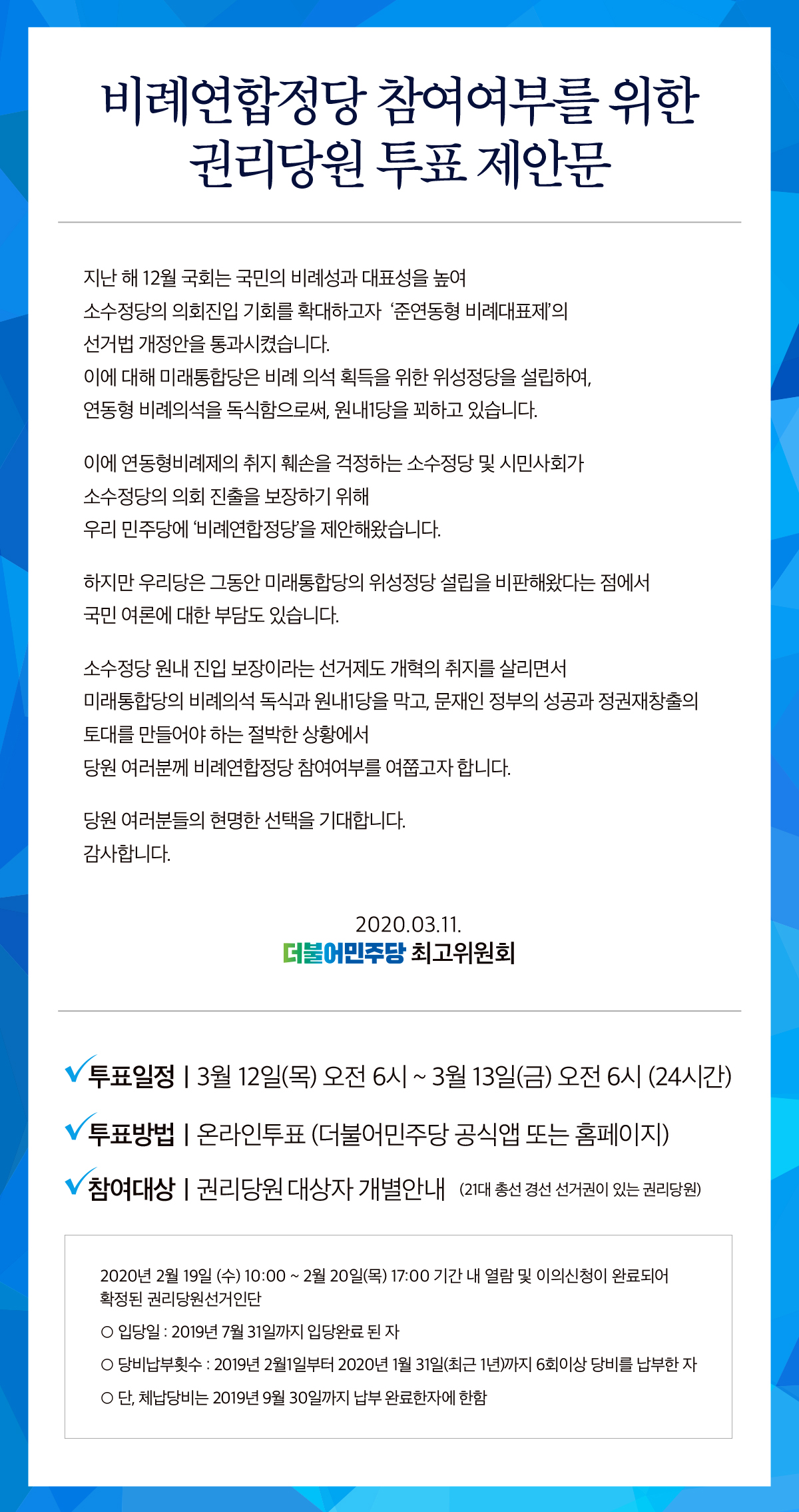 소수정당 원내 진입 보장이라는 선거제도 개혁의 취지를 살리면서 미래통합당의 비례의석 독식과 원내1당을 막고, 문재인 정부의 성공과 정권재창출의 토대를 만들어야 하는 절박한 상황에서 당원 여러분께 비례연합정당 참여여부를 여쭙고자 합니다.