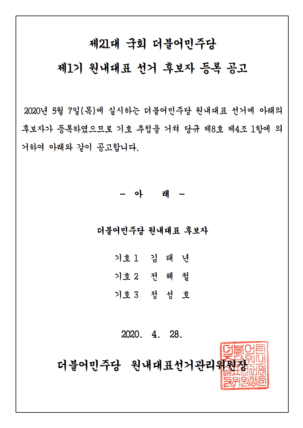 제21대 국회 더불어민주당 제1기 원내대표 선거 후보자 등록 공고