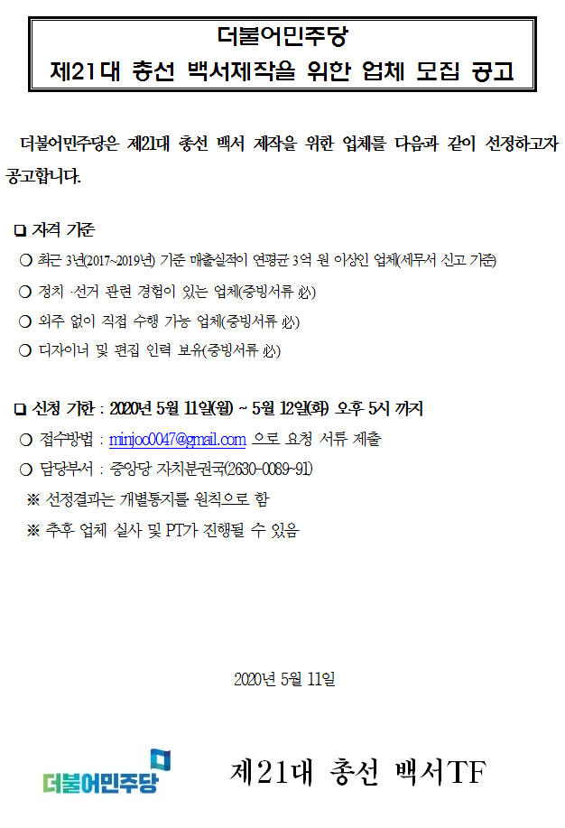 더불어민주당 제21대 총선 백서제작을 위한 업체 모집 공고