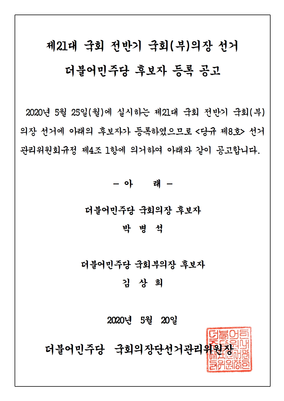 제21대 국회 전반기 국회(부)의장 선거 더불어민주당 후보자 등록 공고
