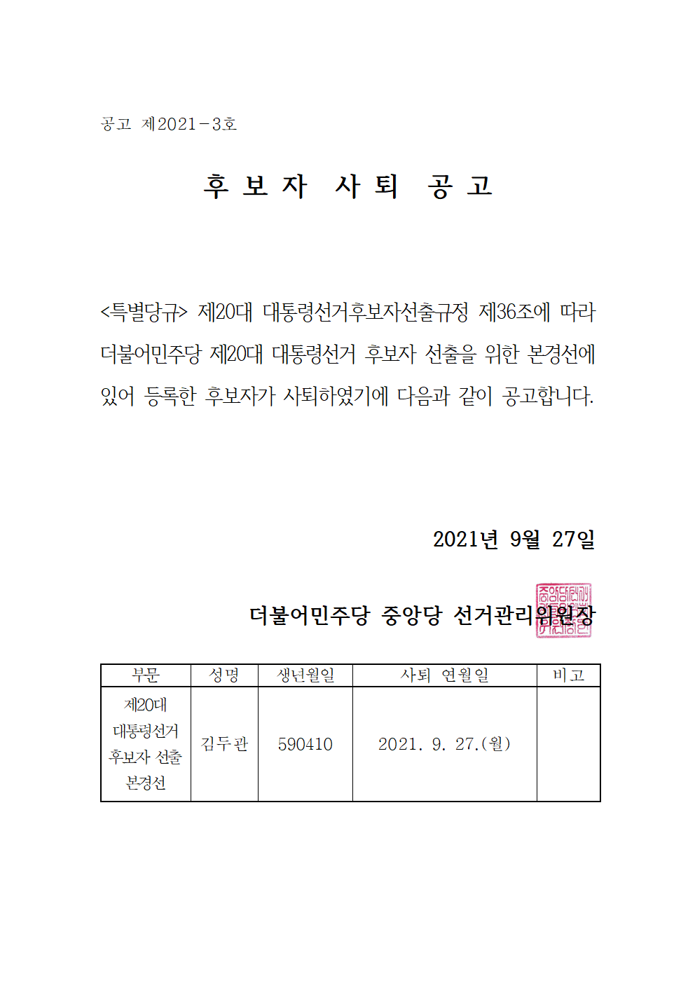 제20대 대통령선거 본경선 후보자 사퇴 공고