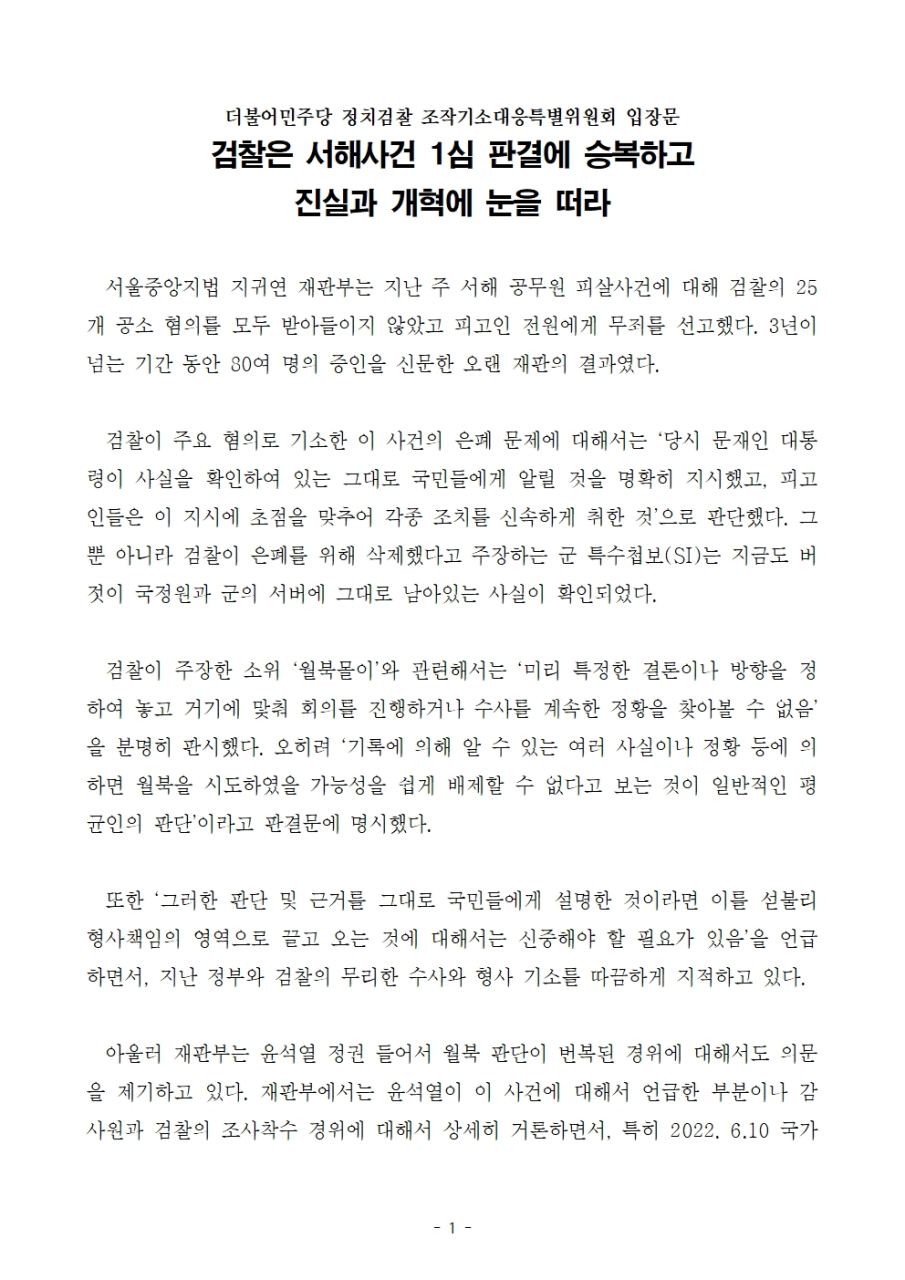 정치검찰 조작기소대응특별위원회, 검찰은 서해사건 1심 판결에 승복하고 진실과 개혁에 눈을 떠라