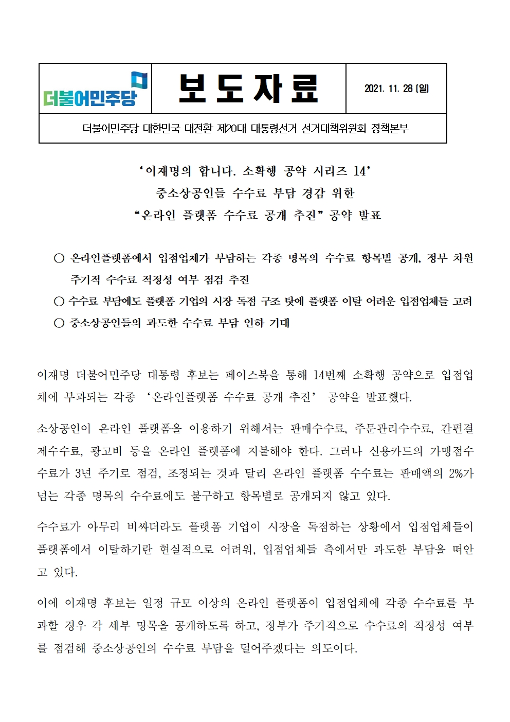[보도자료] 더불어민주당 선대위 정책본부, '이재명의 합니다. 소확행 공약 시리즈 14' 온라인 플랫폼 수수료 공개 추진